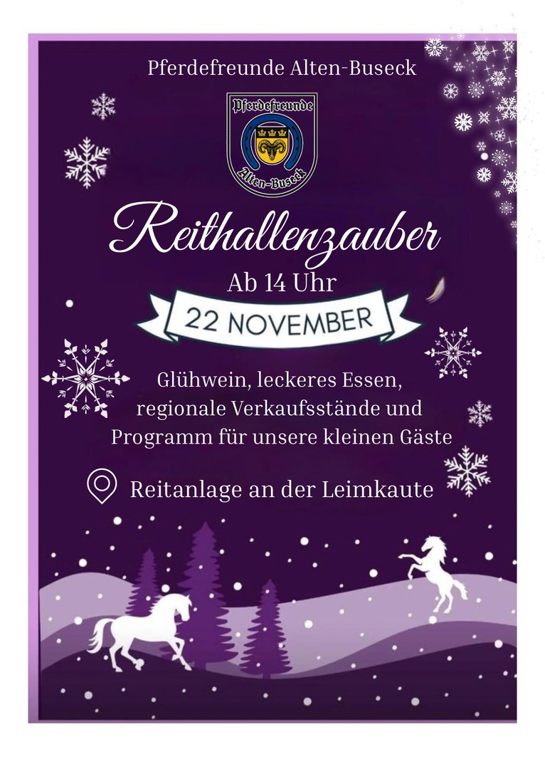 Wir laden am Samstag, 22. November ab 14 Uhr in unsere Reithalle an der Leimenkaute ein. Der erste Glühwein des bevorstehenden Winters, eine leckere Kürbissuppe, Bratwürstchen & Co, oder doch lieber ein Stück Kuchen und eine heiße Waffel - die Pferdefreunde freuen sich, einen gemütlichen Tag mit Euch zu verbringen!